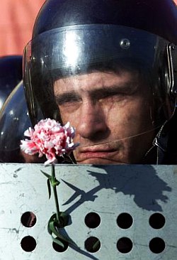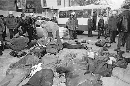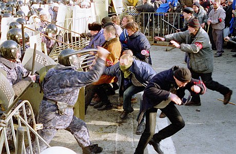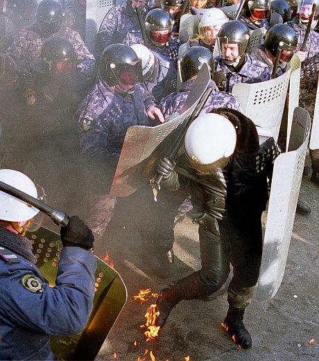 - ...І колона зупинилися навпроти "беркута". Ті, очевидно, на яйця образилися. Коли я добіг у голову колони, то унсовці, які забезпечували охорону колони, вже вступили в сутичку з міліціонерами.