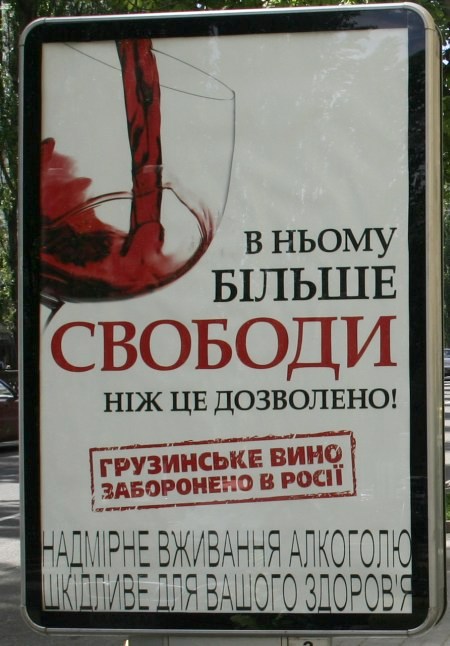 А на обох варіантах щитів внизу в рамці написано "Грузинське вино заборонено в Росії".