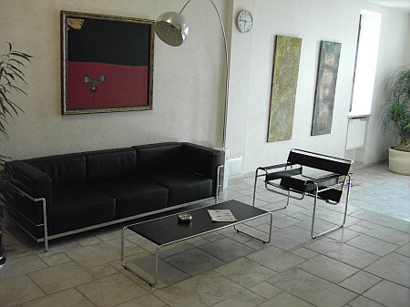 На поверсі Ахметова традиційна для будинків площадка перед квартирами виглядає, як фойє. Тут встановлено диван, крісло і світильник, щоб охорона могла нести службу в більш-менш комфортних умовах. Але на момент нашого візиту нікого не було, тому ми змогли детальніше роздивитися інтер’єр. Наприклад, прямуючи до свого київського помешкання, Ахметов може зупинити погляд на вазонах з рослинами або картинах на стінах.