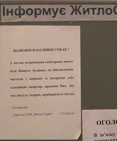 На першому поверсі будинку по Паторжинського, 14 ви натрапляєте на оголошення-заклик до мешканців прибирати за своїми собаками фекалії.