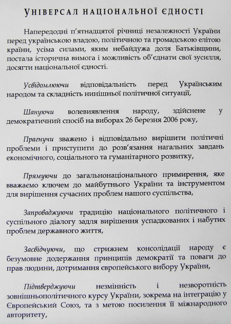 Напередодні п’ятнадцятої річниці незалежності України перед українською владою, політичною та громадською елітою країни, усіма силами, яким небайдужа доля Батьківщини, постала історична вимога і можливість об’єднати свої зусилля, досягти національної єдності.