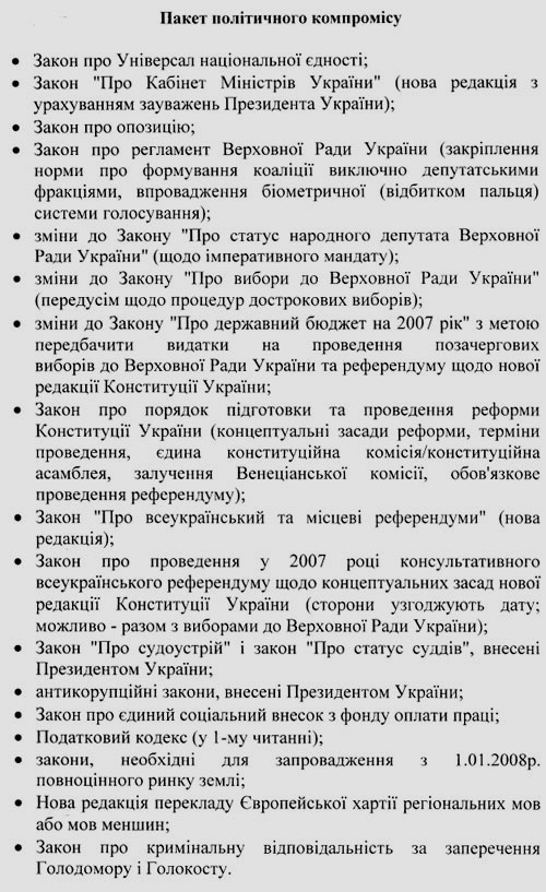 Застосовуючи відносно Януковича методи тиску і переговорів, Ющенко також запропонував коаліції ухвалити "пакет політичного компромісу", який складається з 17 законів.