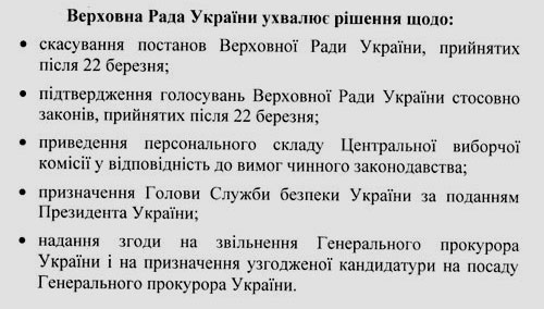 Окремо президент в п'яти пунктах виклав своє бачення того, що має зробити Верховна Рада – визнати недійсними свої рішення, ухвалені слідом за появою указу про розпуск.