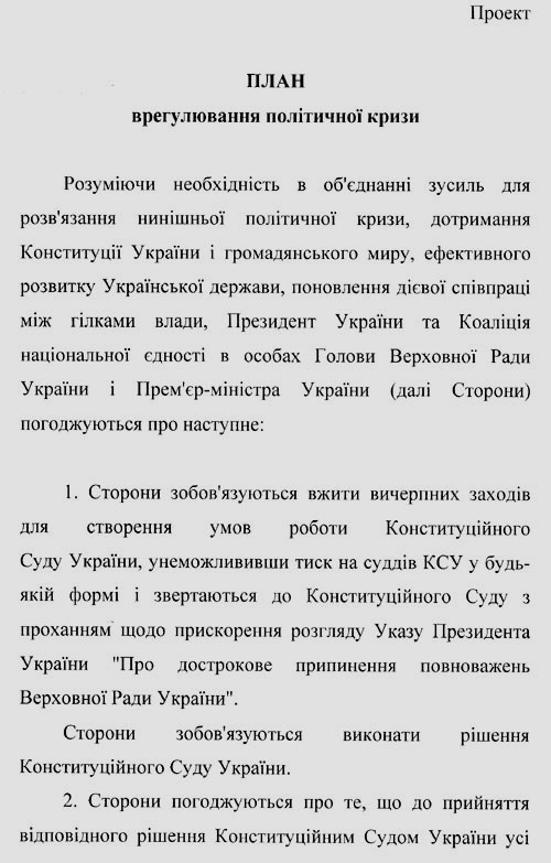 Ще 23 квітня Банковою було підготовлено "План президента для врегулювання політичної кризи", який у середу потрапив до рук "Української правди". Як випливає з тексту, він складається з шести пунктів: