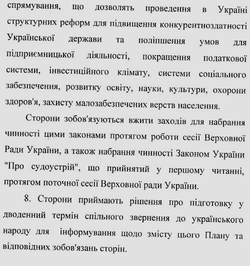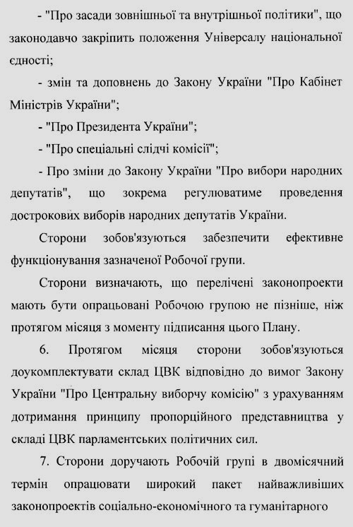 Четверте – до 10 травня має бути підготовлений "пакет політичного компромісу", тобто проектів указів президента і постанов уряду та парламенту..