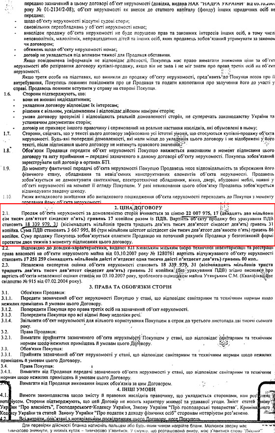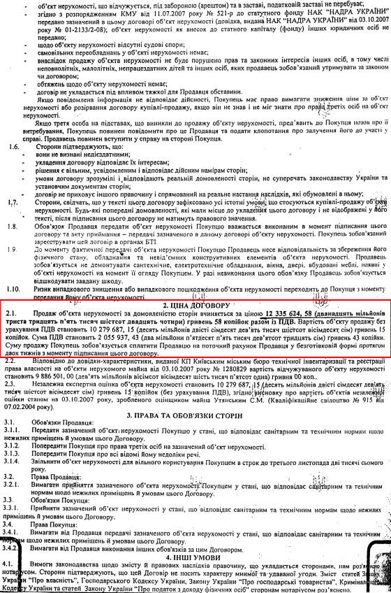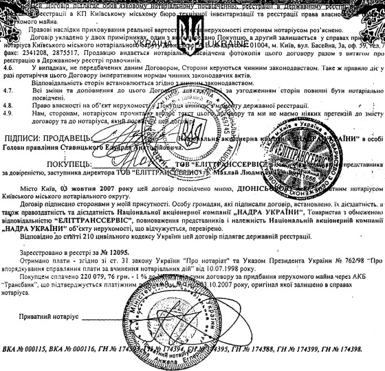 Цікаво, що в угодах, які були підписані Ставицьким з покупцями, тодішнім керівником НАК "Надра України" заявлялося інше: "Продавець стверджує, що на момент укладення договору вказаний об’єкт нерухомості не перебуває під арештом чи забороною, щодо нього не ведуться судові спори, він не заставлений, у податковій заставі не перебуває, треті особи не мають прав на зазначений об’єкт нерухомості..."