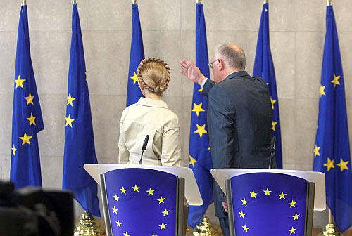 – Я визнаю, що пані Тимошенко здійснює прекрасний прогрес в економічних реформах, – говорив Ферхойген, який зайняв дуже незрозумілу позу, піднявши ліве плече сантиметрів на десять вище правого. – І ми допомагатимемо Україні, щоб європерспективи України стали глибшими.