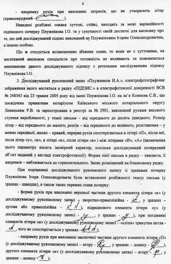 Висновки експертизи Мінюсту: автограф Плужнікова на довіреності "виконаний не Плужніковим, а іншою особою з ретельним наслідуванням підпису Плужнікова".