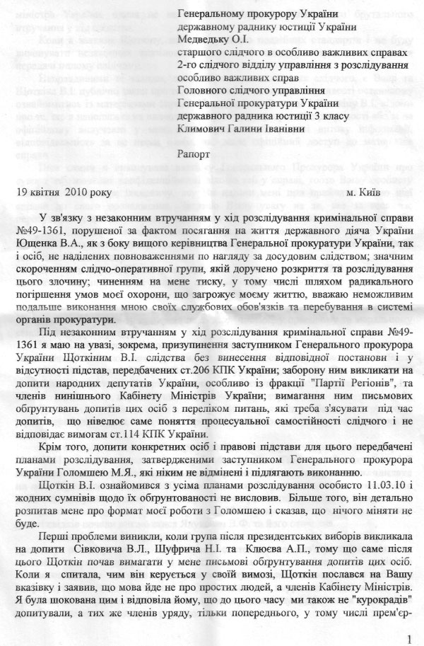 У розпорядження "Української правди" потрапив рапорт Климович на ім'я генпрокурора Медведька. Документ дає уявлення про атмосферу, яка зараз панує у прокуратурі, що намагається підлаштуватися під нового президента.