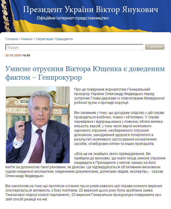 Все це не знайшло свого підтвердження. Ми прийшли до висновку, що мало місце умисне отруєння кандидата в Президенти з метою замаху на його життя за допомогою такої речовини, як діоксин. Це підтверджується об'єктивним висновком судово-медичної експертизи, медичними документами, допитами свідків, експертів", - сказав Медведько у вересні 2009 року.