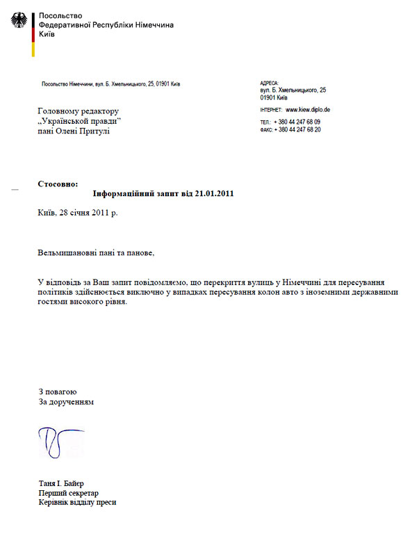 "Повідомляємо, що перекриття вулиць у Німеччині для пересування політиків здійснюється виключно у випадках пересування колон авто з іноземними державними гостями високого рівня", - ідеться у листі посольства ФРН в Україні за підписом першого секретаря Тані Байєр.
