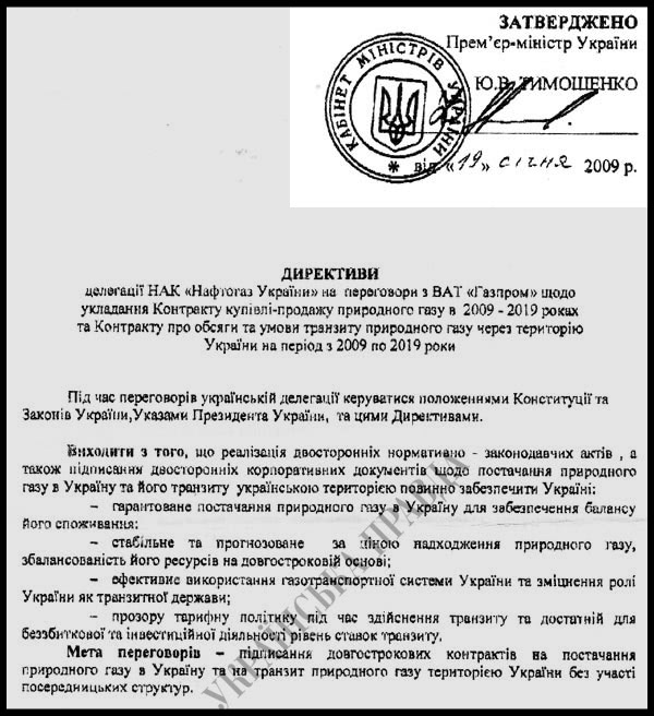 "Відповідно до вказаних висновків інституту, директиви делегації НАК "Нафтогазу України" на переговори з ВАТ "Газпром" стосовно укладення контракту купівлі та продажу природного газу у 2009-2019 роках, та контракту про обсяги та умови транзиту газу територією України на період 2009-20019 роки, затверджені Тимошенко Юлією Володимирівною 19 січня 2009 року, не можуть кваліфікуватися як директиви уряду, затвердження яких регулюється законодавством України".