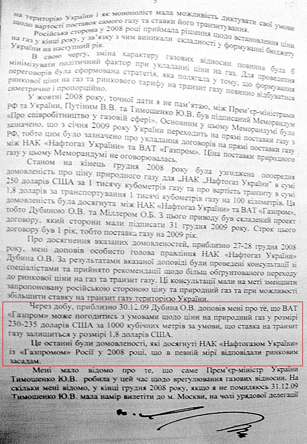 За словами свідка, станом на кінець грудня 2008 року між НАК "Нафтогазом" та Газпромом була попередньо узгоджена ціна на газ в розмірі 250 доларів США за тисячу кубометрів та вартість транзиту 1,8 доларів США за транспортування тисячі кубометрів газу на один кілометр. Про ці домовленості Віктору Ющенку доповів голова НАК "Нафтогазу України" Олег Дубина. Але за результатами цієї доповіді були проведені консультації зі спеціалістами, внаслідок яких пану Дубині було вказано продовжити переговори з метою досягнення більш вигідних умов.