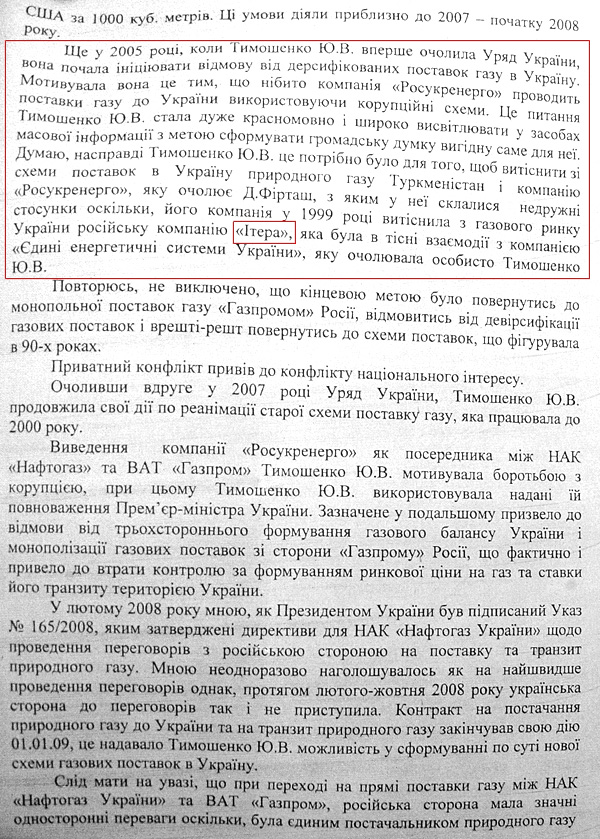 "Про це Тимошенко Ю.В. не поставила мене до відома, і одноособово, без погодження з профільними міністерствами, почала вирішувати газові питання, що призвело до фатальних домовленостей, на підставі яких і були укладені газові контракти від 19.01.09", - говорить Ющенко у своїх свідченнях.