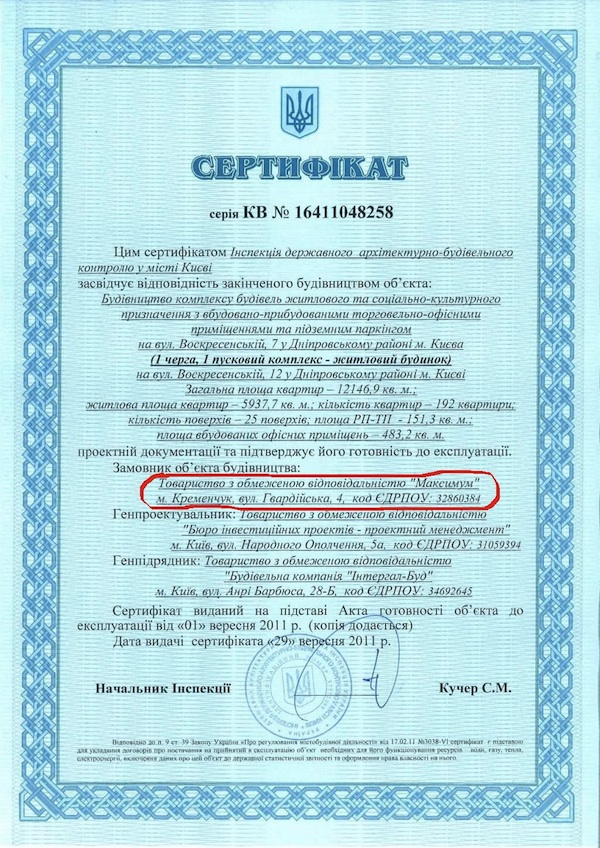 На сайті комплексу замовником будівництва значиться ТОВ “Максимум”. В будівельних ліцензіях “Максимуму”, які викладені вказана адреса фірми: м. Кременчук, вул. Гвардійська 4. Cаме за цією адресою зареєстроване СП “Тайстра” та ще з десяток її дочірніх структур, що входять до описаної схеми безмитного імпорту нафтопродуктів.