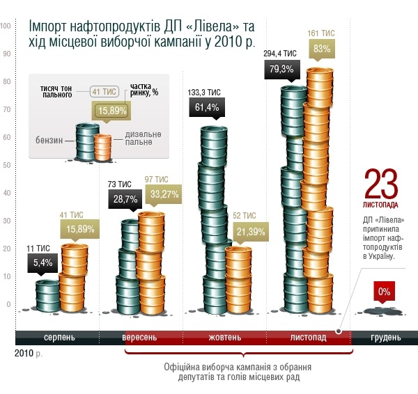 | Імпорт нафтопродуктів "Лівелою" у 2010р. та хід місцевої виборчої кампанії |