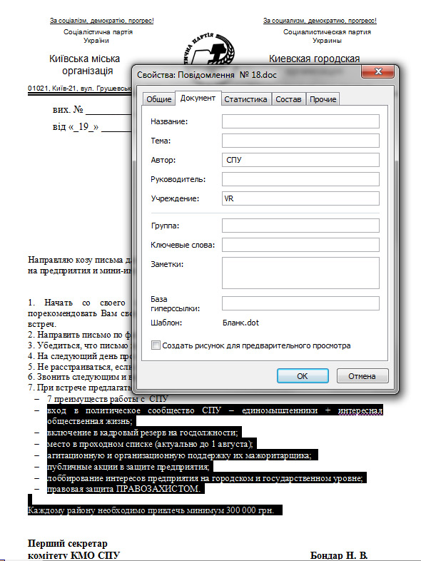 Під документом стоїть авторство Наталії Бондар, однієї із заступниць голови СПУ. У властивостях вордівського файлу вказано, що документ створено в СПУ.