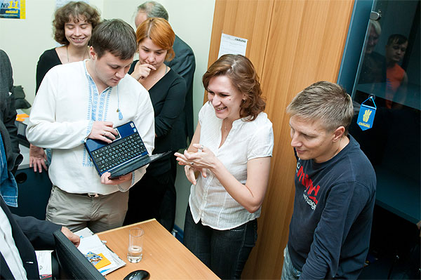 Штаб Тягнибока. Рядові співробітники дивляться результати екзит-полів з комп'ютера. Телевізора нема. Тягнибок, тим часом, пішов у студію Шустера. Фото Артема Жавроцького