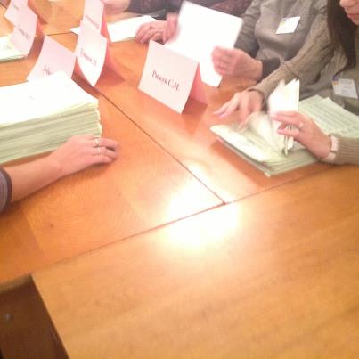 ліва товста стопочка - бюлетені за Зубка від об"єднаної опозиції, права тоненька - за губернатора Рижука від ПР. Це фото однієї з дільниць.