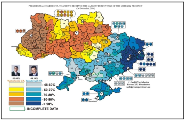 Одещина, що на кордоні з Євросоюзом, голосує за Регіони, а Суми та Чернігів, межуючи з Росією, голосують за помаранчевих.