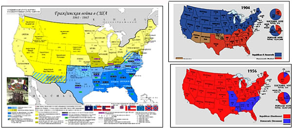 Громадянська війна в США, що поділила країну на Північ і Південь, не закінчилася у 1865. Вона продовжилась як протистояння Демократичної та Республіканської партій. Ось як розподілилися симпатії штатів у 1904 році, через 40 років після війни. Коли переміг один республіканець Теодор Рузвельт, чи 1956, коли переміг Ейзенхауер.