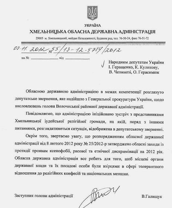 Після цього ОДА видала ще одну відписку, де повідомила депутату – ні, навіть не про перевірку діяльності Добжанського, а про те, що обладміністрація ініціювала зустріч з представниками іудейської громади.