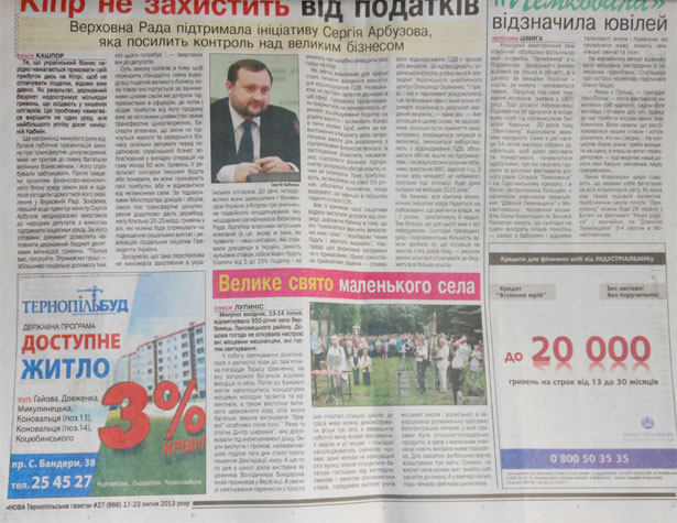 А ще одну джинсову статтю під назвою "Хто наповнить український бюджет?" та підзаголовком "Сергій Арбузов домігся прийняття в парламенті важливих для держави законів" зустрічаємо в тернопільській "Свободі", друкованому органі ОДА та обласної ради, №57 від 17 липня 2013року, "Рівненській газеті", №29 від 18 липня та "Чернігівських відомостях", газеті Чернігівської міської ради.