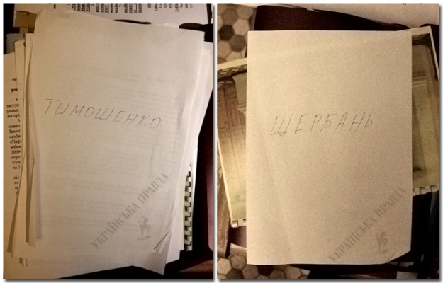 | Дело лидера "Батькивщины" в двух объемных стопках, на каждой из которых сверху лежали листы с надписями от руки "Тимошенко" и "Щербань" |
