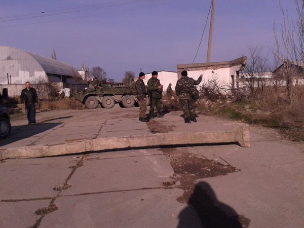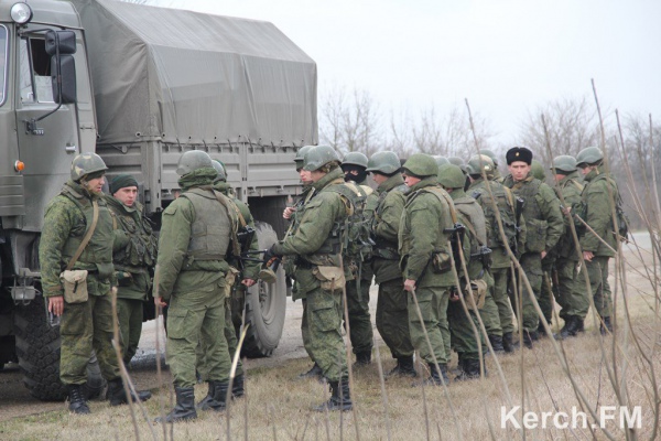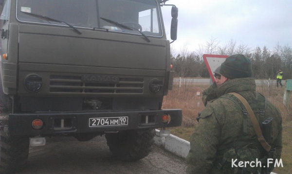 Возле воинской части А0883 (Керчь 9-й километр) подъехали два грузовика с российскими номерами (90-й регион). Эта часть охраняет воздушное пространство Украины. В грузовиках около 20 военных в касках, некоторые из них в масках. Две машины стоят прямо рядом со входом. Один из бойцов беседует с украинскими военными.
