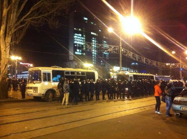Возле ОГА стоят несколько отрядов Внутренних войск со щитами.