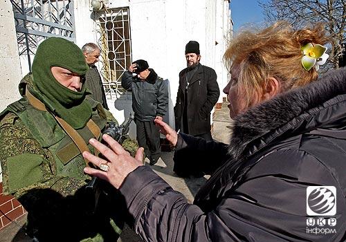 Митинг в Симферополе: "Вы не наши женщины! Мы вас не уважаем!", кричали в среду днем около заблокированной  "самообороной" военной части женщинам, которые собрались на митинг  "Женщины за мир".