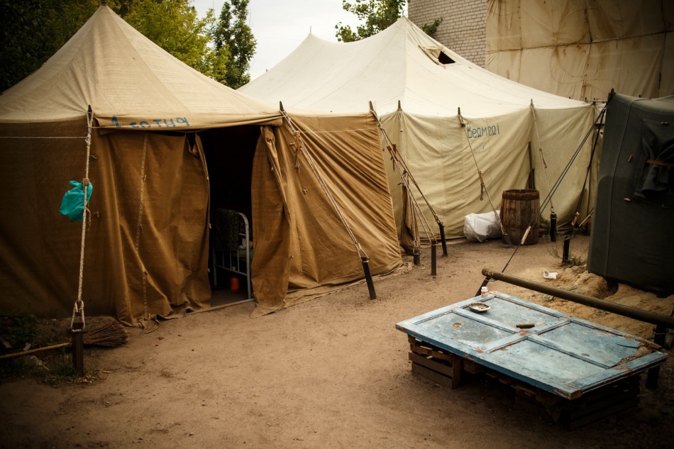| База "Айдару" у селі Половинкине. Тут айдарівці живуть у палатках, які позначені звичним на Майдані способом – сотнями. У вільний час дивляться телевізор |