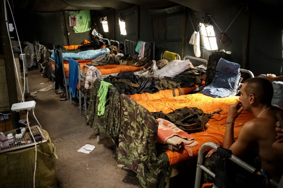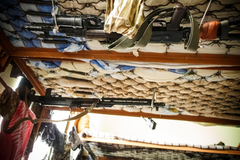 У самих казармах тісно, у проходах – каски й бронежилети, на самих ліжках – написи Демон, Балкан, Корень – прізвиська тих, хто на них лежить. Збоку чи над постіллю підвішені автомати, на стінах і навіть під подушками – українські прапори.