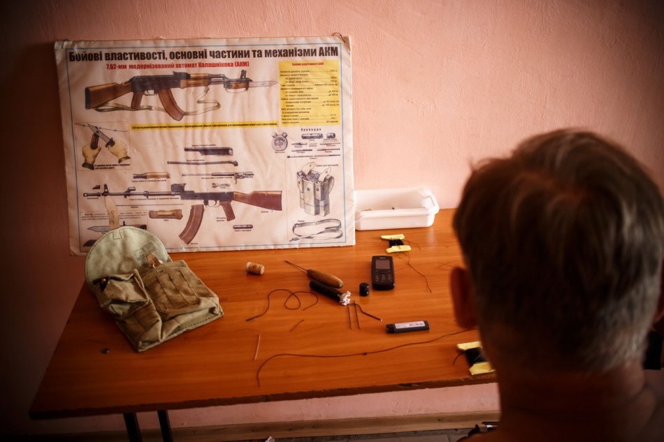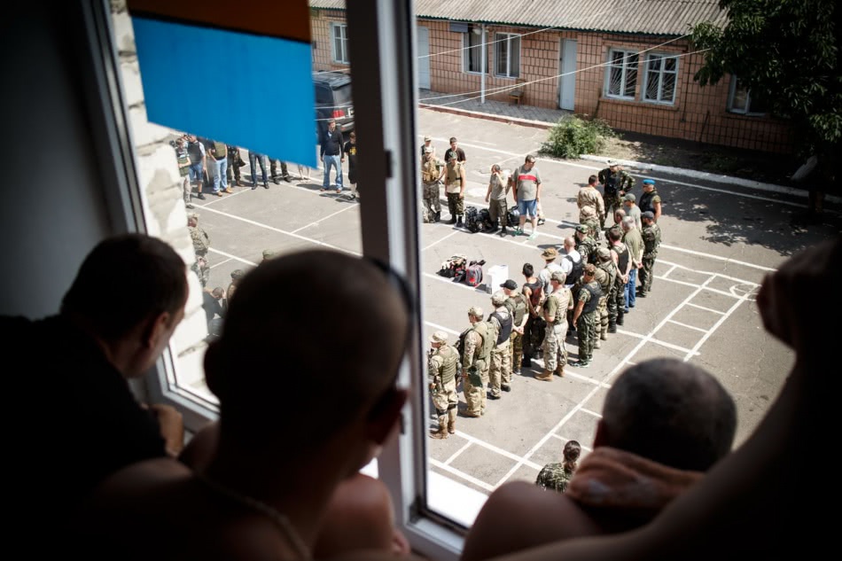 Поряд у коридорі казарми бійці грають у шахи, трохи далі перед схемою автомату Калашникова сидить чоловік і зосереджено розглядає свою зброю. Ніяково опускаю очі, коли поряд проходить черговий айдарівець у спідньому: у цьому царстві чоловіків ніхто не переймається такими дрібницями, – тут головне перепочити, дізнатись новини, приготувати зброю до походу на передову.