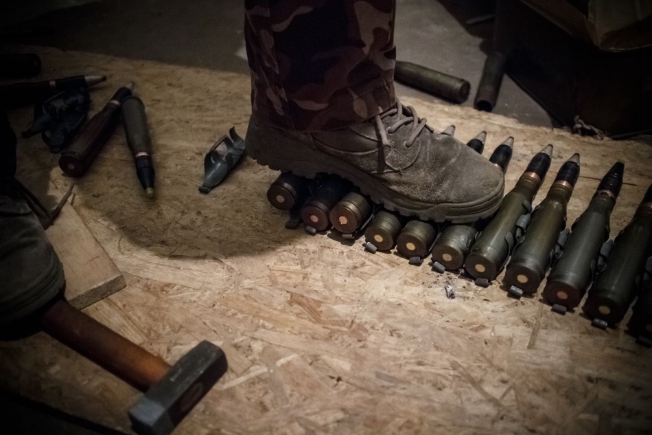 | На базу привезли зенітку та боєприпаси. Айдарівець молотком і ногами вкладає снаряди в залізні форми |