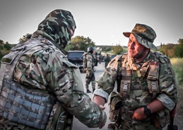 Бойцы "Правого сектора" вместе с Дмитрием Ярошем стояли неподалеку от базы разведчиков батальона "Донбасс", куда прибыл Семен Семенченко. В полевых условиях командир батальона "Донбасс" ходит с неприкрытым лицом, хотя в медиа традиционно появляется в балаклаве. Нам пришлось уговорить Семенченко надеть балаклаву, чтобы записать это интервью на камеру.