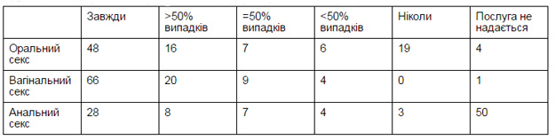 | Таблиця 1. Використання презервативів (%) при наданні секс-послуг |
