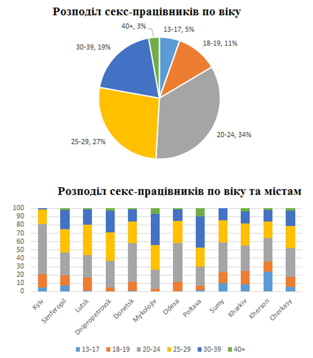 На Малюнку 1 (за основу якого взята Таблиця 1.1 з дослідження Моніторинг секс-працівників - 2008) показана вікова структура секс-працівників в Україні. Варто відзначити, що більшість секс-працівників належать до вікової категорії 20-29 років. Тим не менш, наводяться шокуючі дані, що 24% секс-працівників у Херсоні знаходяться у віковій категорії від 13 до 17 років. Опитування також показало, що лише 8% секс-працівників по всій країні мають постійне місце роботи (не пов'язане з наданням секс-послуг), у той час як 41% опитаних вказали статус "безробітний/а". Останні події в економіці України та економічна криза, швидше за все, змусять більшу кількість жінок працювати в сфері надання секс-послуг.