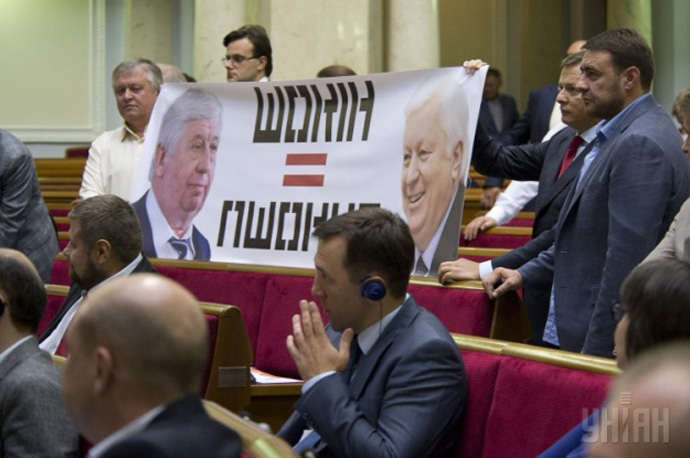 Ляшко із одно партійцями, які зовсім недавно вийшли з коаліції, навіть принесли плакат з написом "Шокін=Пшонка".