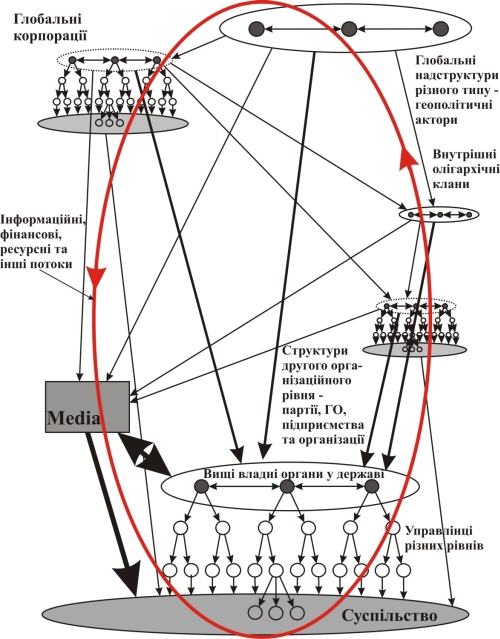 Для повноти картини слід відзначити взаємовплив сукупності медіа та вищих органів влади через створення інформаційних приводів, що також у якійсь мірі формує безструктурні поля впливу в українському суспільстві.