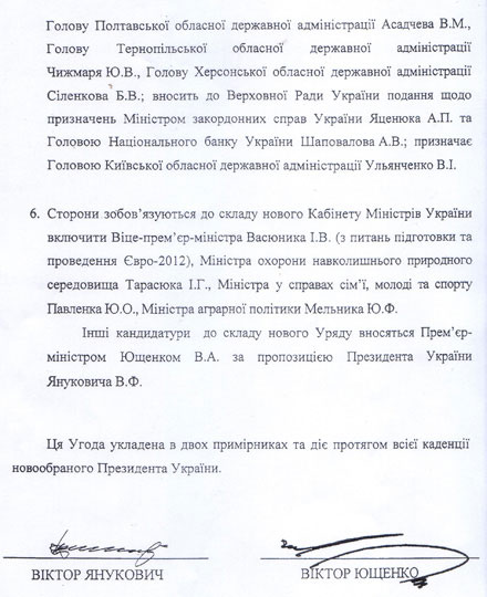 Згідно з угодою за підписами Ющенка і Януковича, у разі обрання лідера Партії регіонів главою держави, чинний президент стає прем'єром.
