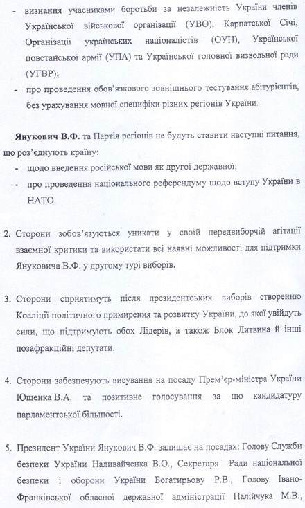 Козачок повідомив, що, відповідно до цієї угоди, сторони зобов'язуються уникати взаємної критики та використати усі можливості для підтримки Януковича у другому турі.
