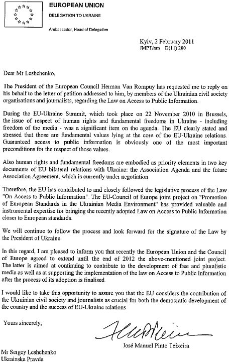 Про це йдеться у відповіді Європейського союзу на звернення журналістів до голови Євросоюзу Германа Ван Ромпея щодо ухвалення закону "Про доступ до публічної інформації".