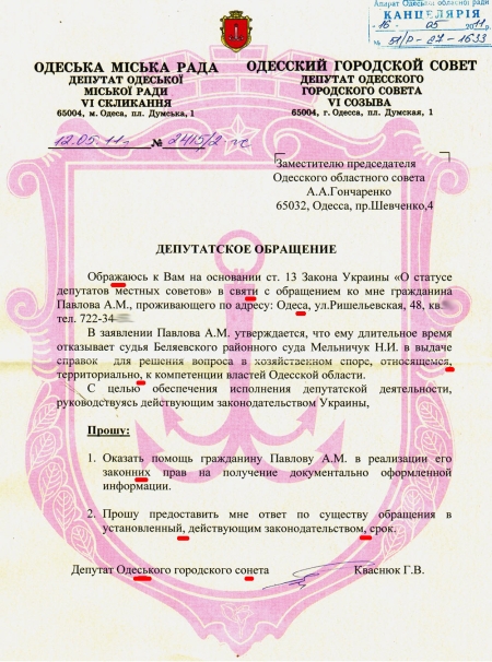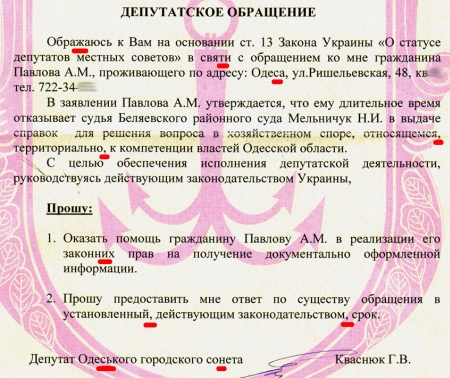 Кваснюк у депутатському запиті підписаний як "депутат Одеського міського сонета".