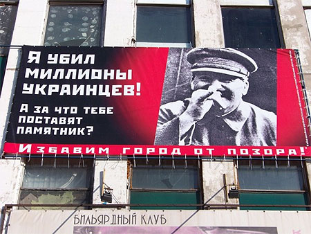 На плакаті 3х6 метрів зображений Сталін і напис: "Я вбив мільйони українців! А за що тобі поставлять пам'ятник?".