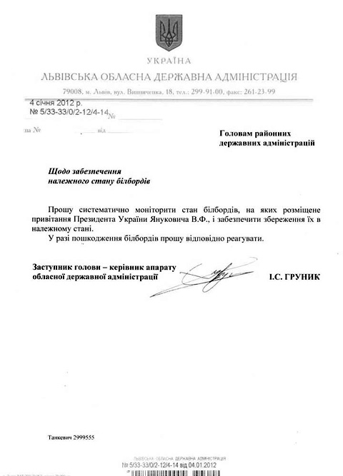 "Прошу систематично моніторити стан білбордів, на яких розміщене привітання Президента України Януковича В.Ф., і забезпечити збереження їх в належному стані", - пише у своєму розпорядженні Груник.
