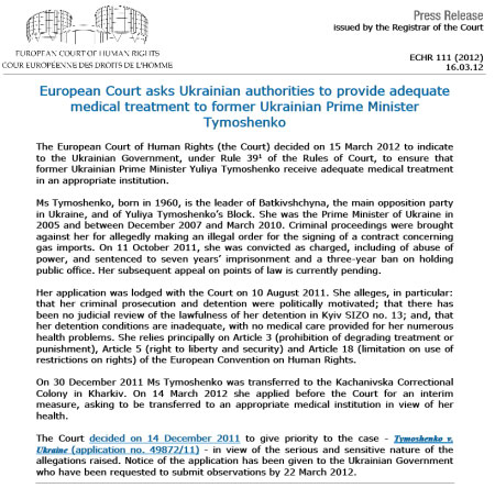 "15 березня 2012 року Європейський суд з прав людини вирішив вказати уряду України, на підставі правила 39-1 правил суду, забезпечити отримання Юлією Тимошенко адекватної медичної допомоги у відповідній інституції", - сказано в прес-релізі.