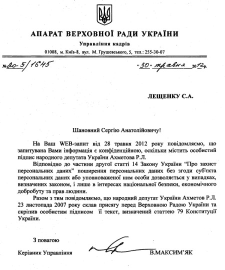 Як ідеться у відповіді на запит Української правди, "запитувана Вами інформація є конфіденційною, оскільки містить особистий підпис народного депутата Ахметова Р.Л."