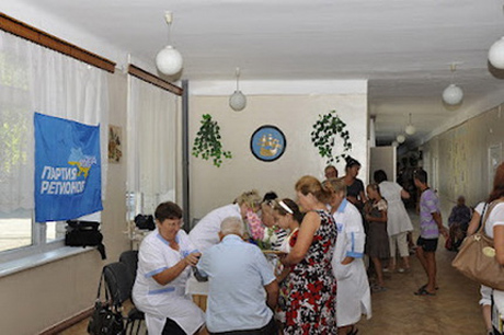 Символіка Партії регіонів розташовується на стінах лікарень та одязі медпрацівників, в приміщеннях також роздається агітаційна продукція "регіоналів".