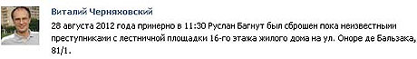 Водночас в міліції зазначили, що в записах інформації про те, що Багмут був викинутий з вікна, немає і справа проходить як нещасний випадок.
